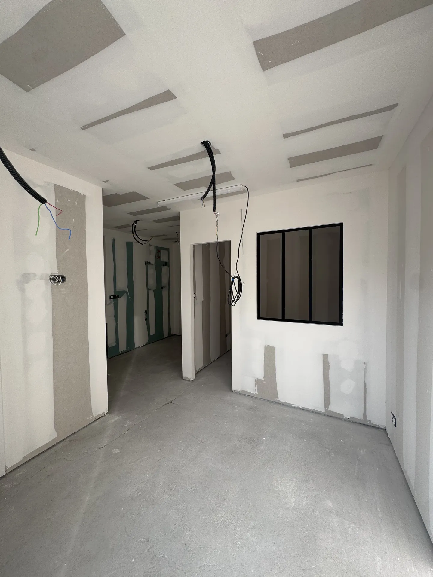 Sur ce chantier récent, nous sommes intervenus sur du placo neuf pour transformer un volume imposant en une pièce de vie aux murs parfaitement lisses.